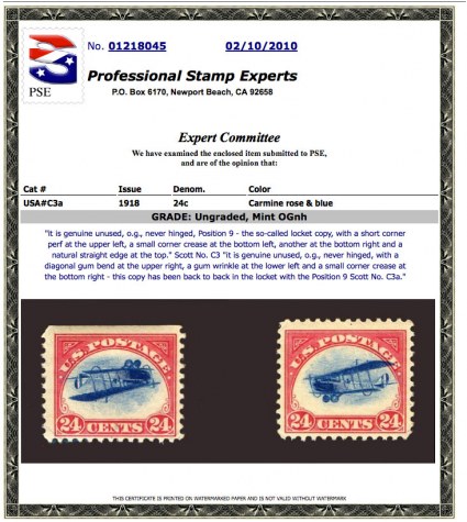 "it is genuine unused, o.g., never hinged, Position 9 - the so-called locket copy, with a short corner perf at the upper left, a small corner crease at the bottom left, another at the bottom right and a natural straight edge at the top." Scott No. C3 "it is genuine unused, o.g., never hinged, with a diagonal gum bend at the upper right, a gum wrinkle at the lower left and a small corner crease at the bottom right - this copy has been back to back in the locket with the Position 9 Scott No. C3a."