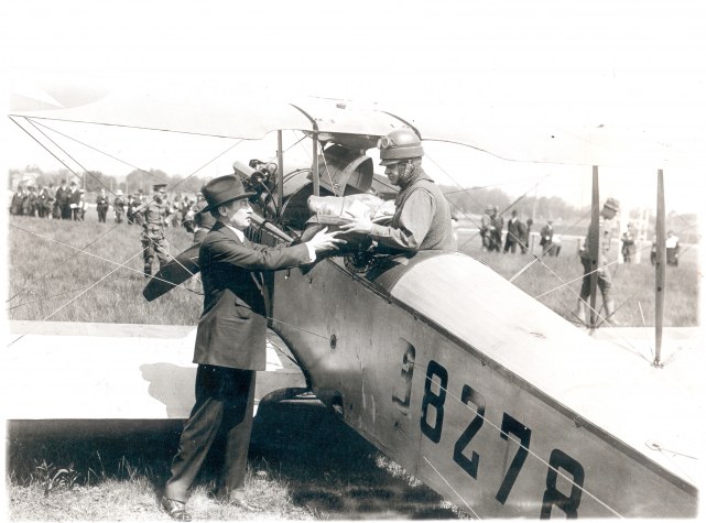 Ovington carried 640 letters and 1,280 postcards on the 23 September first flight between Garden City and Mineola in a French-manufactured Bleriot “Dragonfly” monoplane. He continued to carry mail during the event, as weather permitted.