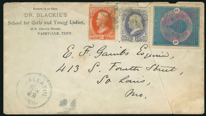 Three covers with the Buffalo Balloon stamp are recorded. Two have Gallatin postmarks dated 18 June and are known positively to have been flown from Nashville. A third has no postal markings and is believed to have been carried on a different flight.