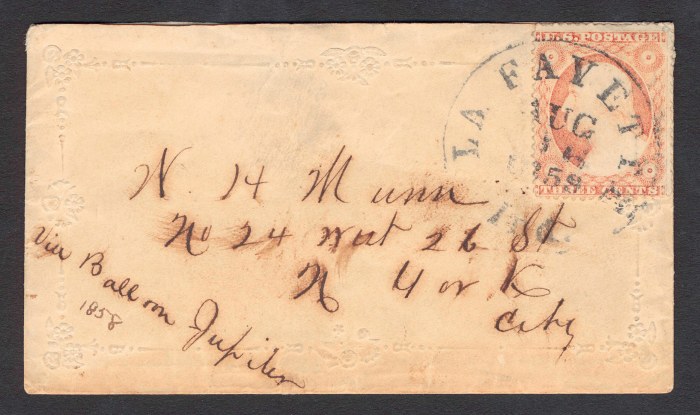Back to TopJupiter Flight – The earliest recorded U.S. official “airmail” flight took place in August 1859. The plan was to carry a mailbag from Lafayette, Ind., east to New York City (or as far as possible) on board the balloon Jupiter, piloted by famed balloonist, Professor John Wise.