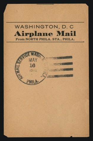 Northbound Flight from Washington to New York via Philadelphia (16 May) – The undelivered Washington mail from Lieut. Boyle's crashed Jenny was carried on the second day of service, and both dates – 15 and 16 May – are considered to be First Trip mail. In fact, the words “First Trip” were reinserted into the special datestamp with the 16 May date and used to postmark some of the mail.