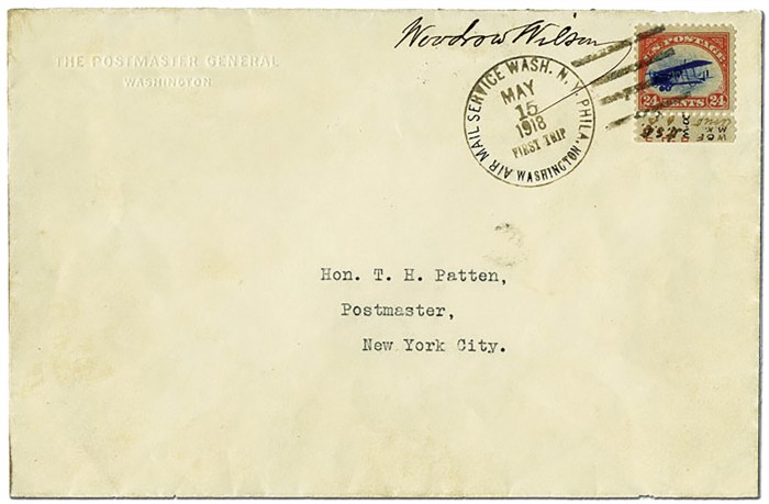 Among the letters was one from New York Postmaster Patten to President Wilson and Postmaster General Burleson, congratulating them on the inauguration of airmail service.