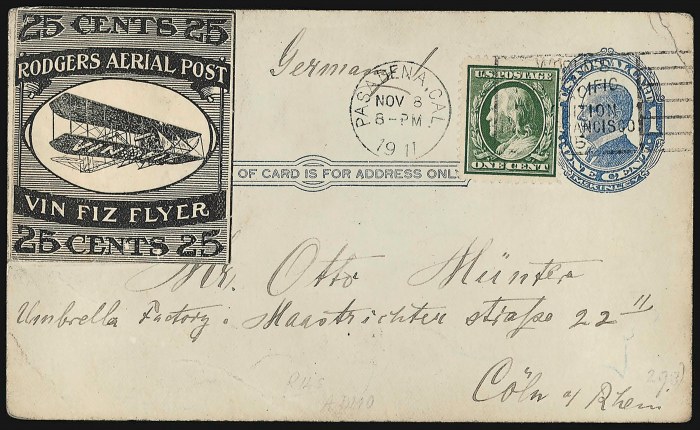The USPOD was not directly involved with any of the Rodgers flights, although local postmasters apparently offered their cooperation. All of the special markings found on Vin Fiz mail and the 25¢ adhesive stamp sold by Rodgers and his entourage were unofficial. Rodgers collected letters along the way and flew them between stops or on daily exhibition flights.