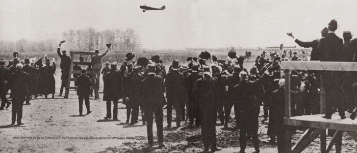 Around 3:30 p.m., as Lieut. Culver approached Belmont Field, he was joined by two planes that had taken off from the nearby Hazelhurst airfield, and they flew in formation for the final approach. Lieut. Culver landed at 3:37 p.m. and was greeted by a crowd of onlookers who pushed forward, dangerously close to his moving plane.