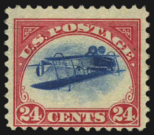 This stamp was once part of a horizontal pair, with Position 11, owned by Joseph Steinmetz of Philadelphia. According to the Amick book (p. 80), Steinmetz took this pair of the Inverted Jenny's as his share of the profit when the sheet was first sold.
