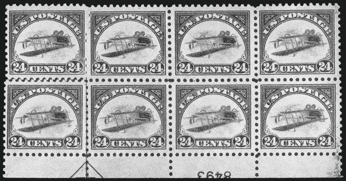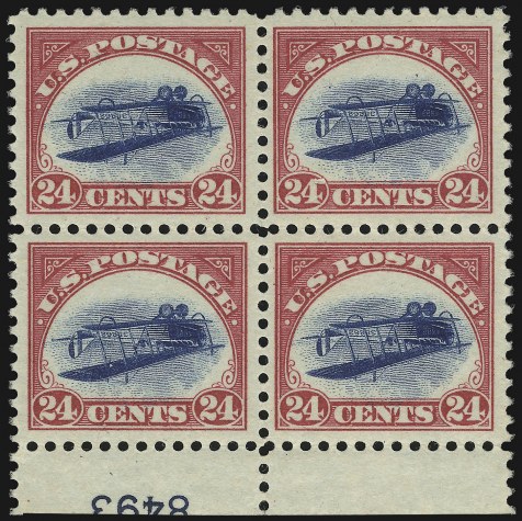 The unique plate block was one of the items retained by the original purchaser of the sheet of Inverted Jenny's, Colonel Edward H.R. Green. The plate block of eight was offered in a 1944 auction of part of the Green collection, where it was purchased for $27,000 by Amos Eno, who used the dealer Y. Souren as his agent.