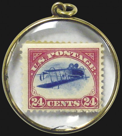 This is the famous "locket copy", which was presented by Colonel Green to his wife Mabel. The pendant is made of two round pieces of glass with a gold rim and clasp for a chain. Sandwiched between the glass is the Inverted Jenny back to back with a normal 24c stamp. The bottom corners were slightly creased when the stamp was placed in the locket.