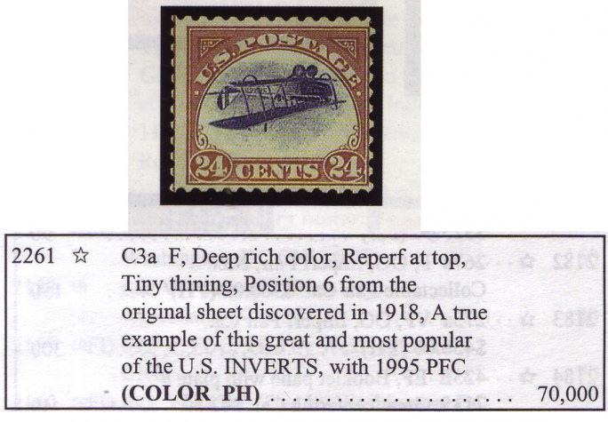 C3a ,Fine, Deep rich color, Reperf at top, Tiny thinning, Position 6 from the original sheet discovered in 1918, A true example of this great and most popular of the U.S. INVERTS, with 1995 PFC (COLOR PH)