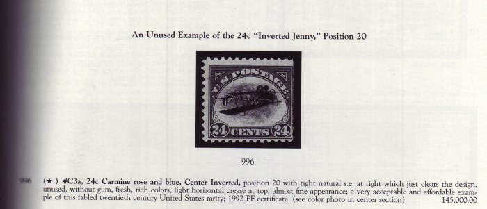 #C3a, 24c Carmine rose and blue, Center Inverted, position 20 with tight natural s.e. at right which just clears the design, unused, without gum, fresh, rich colors, light horizontal crease at top, almost fine appearance; a very acceptable and affordable example