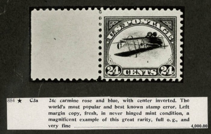 C3a 24c carmine rose and blue, with center inverted. The world's most popular and best known stamp error. Left margin copy, fresh in never hinged mint condition, a magnificent example of this great rarity, full o.g. and very fine