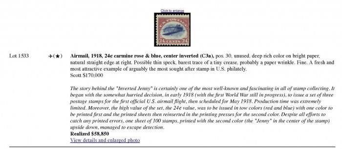 The story behind the "Inverted Jenny" is certainly one of the most well-known and fascinating in all of stamp collecting. It began with the somewhat hurried decision, in early 1918 (with the first World War still in progress), to issue a set of three postage stamps for the first official U.S. airmail flight, then scheduled for May 1918. Production time was extremely limited. Moreover, the high value of the set, the 24¢ value, was to be issued in tow colors (red and blue) with one color to be printed first and the printed sheets then reinserted in the printing presses for the second color. Despite all efforts to catch any printed errors, one sheet of 100 stamps, printed with the second color (the "Jenny" in the center of the stamp) upside down, managed to escape detection.