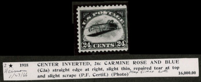 CENTER INVERTED, 24c CARMINE ROSE AND BLUE (C3a) straight edge at right, slight thin, repaired tear at top and slight scrape (P.F. Certif.)