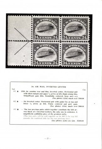 Lot 461 -- 24c carmine rose and blue, inverted center. Horizontal pair with sheet margin and upper 1/2 arrow at left. Right. stamp tiny, insignificant gum thin. Beautifully centered, large part o.g.