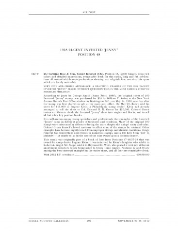 According to Jenny by George Amick (Amos Press, 1986), the original sheet of 100 Inverted "Jenny" stamps was purchased for $24 by William T. Robey at the New York Avenue Branch Post Office window in Washington D.C., on May 14, 1918, one day after the stamp was first placed on sale at the main post office. On May 20, Robey sold his sheet for $15,000 to Eugene Klein, a Philadelphia stamp dealer. Klein had already arranged to sell the sheet to Col. Edward H. R. Green for $20,000. Colonel Green instructed Klein to divide the Inverted "Jenny" sheet into singles and blocks, and to sell all but a few key position blocks.