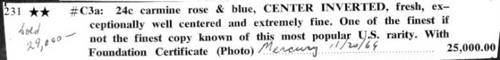 #C3a 24c carmine rose & blue CENTER INVERTED, fresh, exceptionally well-centered and extremely fine. One of the finest if not the finest copy known of this most popular U.S. rarity. With Foundation certificate.