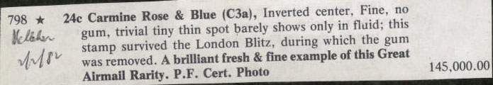 24c Carmine Rose & Blue (C3a). Inverted center, Fine, no gum, trivial tiny thin spot barely shows only in fluid; this stamp survived the London Blitz, during which the gum was removed; a brilliant, fresh & fine example of this Great Airmail Rarity. P.F. Cert.