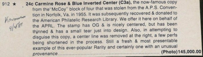 24c Carmine Rose & Blue Inverted Center (C3a), the now-famous copy from the McCoy .. block of four that was stolen from the A.P.S. Convention