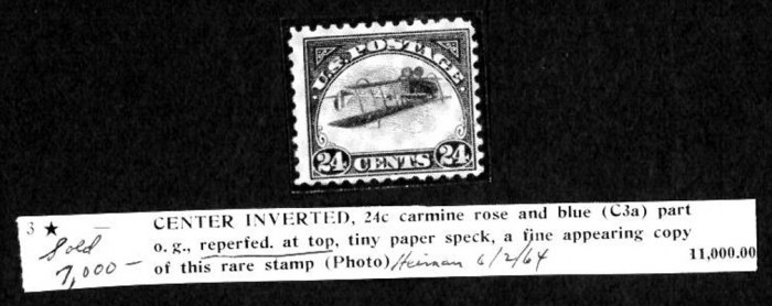 CENTER INVERTED, 24c carmine rose and blue (C3a), part o.g., reperfed at top, tiny paper speck, a fine appearing example of this rare stamp