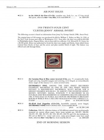 EXTREMELY FINE, AMONG THE VERY FINEST RECORDED EXAMPLES, REGARDED AS ONE OF THE TWO FINEST SINGLES EXTANT, A MAGNIFICENT SHOWPIECE, SCOTT RETAIL FOR A HTNGED EXAMPLE $135,000.00+. IN AMICK'S THE INVERTED JENNY: MONEY, MYSTERY, MANIA, POSITION 77 IS RECORDED AS EX DOUGLAS AND WAS EXHIBITED AT AMERIPEX HELD IN CHICAGO IN 1986. IT WAS SOLD AT PUBLIC AUCTION IN 1982 WHERE IT BROUGHT $198,000.00 WHICH WAS A RECORD REALIZATION FOR A SINGLE U.S. STAMP