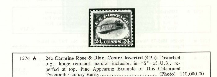 24c Carmine Rose & Blue, Center Inverted (C3a).> Disturbed o.g., hinge remnant, natural inclusion in "S" of "U.S.", reperfed at top, Fine Appearing Example Of This Celebrated Twentieth Century Rarity