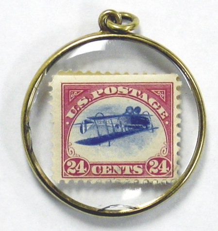 Presented here is the pendant containing a 24c Inverted Jenny, given by Colonel Edward H. R. Green to his wife, Mabel. The pendant is made of two round pieces of glass with a gold rim and clasp for a chain. Sandwiched between the glass is the Inverted Jenny back to back with a normal 24c stamp. The Inverted Jenny comes from Position 9 in the top row of the original pane of 100. It has a natural straight edge at top. The bottom corners were slightly creased when the stamp was placed in the locket.