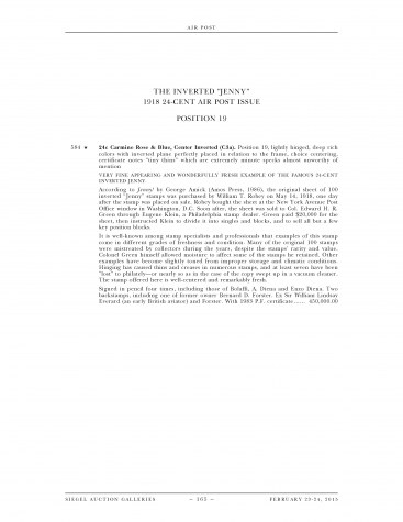 According to Jenny! by George Amick (Amos Press, 1986), the original sheet of 100 inverted "Jenny" stamps was purchased by William T. Robey on May 14, 1918, one day after the stamp was placed on sale. Robey bought the sheet at the New York Avenue Post Office window in Washington, D.C. Soon after, the sheet was sold to Col. Edward H. R. Green through Eugene Klein, a Philadelphia stamp dealer. Green paid $20,000 for the sheet, then instructed Klein to divide it into singles and blocks, and to sell all but a few key position blocks.