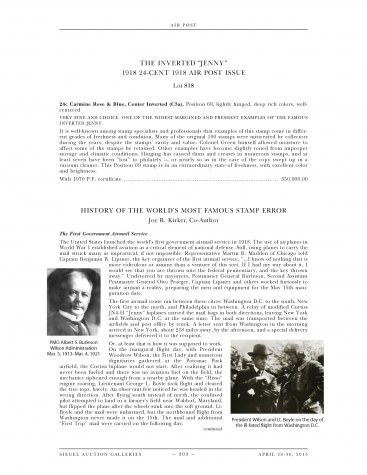 According to Jenny! by George Amick (Amos Press, 1986), the original sheet of 100 inverted "Jenny" stamps was purchased by William T. Robey on May 14, 1918, one day after the stamp was placed on sale. Robey bought the sheet at the New York Avenue Post Office window in Washington, D.C. Soon after, the sheet was sold to Col. Edward H. R. Green through Eugene Klein, a Philadelphia stamp dealer. Green paid $20,000 for the sheet, then instructed Klein to divide it into singles and blocks, and to sell all but a few key position blocks.