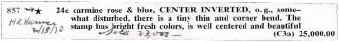 24c carmine rose & blue, CENTER INVERTED, o.g., somewhat disturbed, there is a tiny thin and corner bend, the stamp has bright fresh colors, is well centered and beautiful