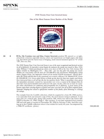 The 1918 Twenty Four Cent Inverted Jenny is one of the most recognized and desired rarities in all of philately. Its legendary status began the moment the stamp was issued in May, 1918, when William T Robey purchased an entire error sheet of 100 at the New York Avenue Post Office window in Washington D.C. -May 14th -just one day after the stamp was issued. Within one week Robey sold the sheet for $15,000.00 to the well-known Philadelphia stamp dealer Eugene Klein (an impressive return on his initial $24.00 investment). Shortly thereafter Mr. Klein sold the sheet to the renowned, yet eccentric collector, Col. Edward H.R. Green for $20,000.00. Col. Green asked Klein to break up the sheet forĀ· him into singles and blocks, then instructed him to sell all but the few key position blocks. What is puzzling is how, given the immediate attention created by a spectacular new error, so many of the stamps from the sheet have been poorly handled and stored over the years. In fact, there are at least six examples whose whereabouts are unknown and presumably lost to philately. A great many of the known copies have varying degrees of faults and some even have lost all of their original gum. Improper hinging has caused a significant number of the faults, often thinning or creasing the stamps.