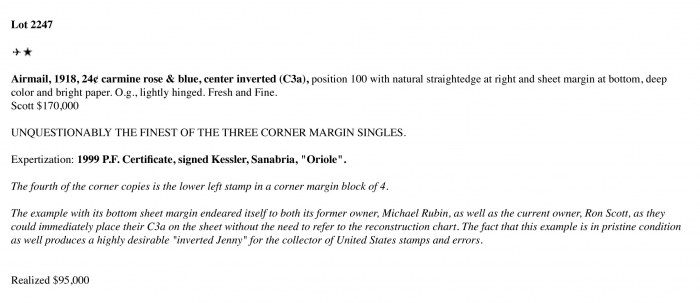 The example with its bottom sheet margin endeared itself to both its former owner, Michael Rubin, as well as the current owner, Ron Scott, as they could immediately place their C3a on the sheet without the need to refer to the reconstruction chart. The fact that this example is in pristine condition as well produces a highly desirable "inverted Jenny" for the collector of United States stamps and errors.