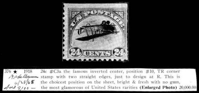 24c #C3a. the famous inverted center position #10, TR corner stamp with two straight edges, just to design at R. This is the choicest position on the sheet, bright & fresh with no gum, the most glamorous of United States rarities