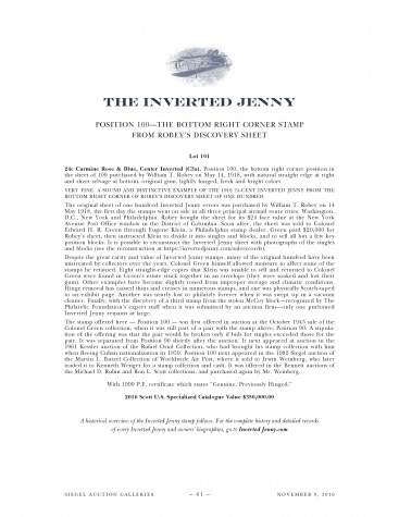 The stamp offered here -- Position 100 -- was first offered in auction at the October 1945 sale of the Colonel Green collection, when it was still part of a pair with the stamp above, Position 90. A stipulation of the offering was that the pair would be broken only if bids for singles exceeded those for the pair. It was separated from Position 90 shortly after the auction. It next appeared at auction in the 1961 Kessler auction of the Rafael Oriol Collection, who had brought his stamp collection with him when fleeing Cuban nationalization in 1959. Position 100 next appeared in the 1982 Siegel auction of the Martin L. Butzel Collection of Worldwide Air Post, where it sold to Irwin Weinberg, who later traded it to Kenneth Wenger for a stamp collection and cash. It was offered in the Bennett auctions of the Michael D. Rubin and Ron L. Scott collections, and purchased again by Mr. Weinberg.