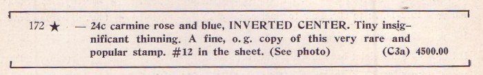 24c carmine rose and blue, INVERTED CENTER. Tiny insignificant