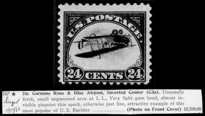 24c Carmine Rose & Blue Airpost, Inverted Center (C3a). Unusually fresh, small ungummed area at L.L., Very light gum bend, almost invisible pin point thin speck, otherwise just fine, attractive example of this most popular of U.S. Rarities