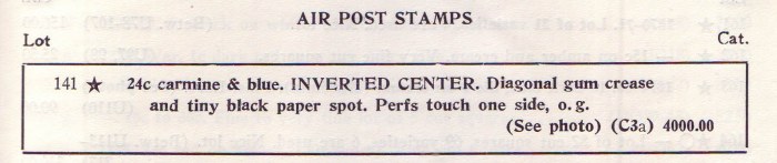 24c carmine & blue. INVERTED CENTER. Diagonal gum crease