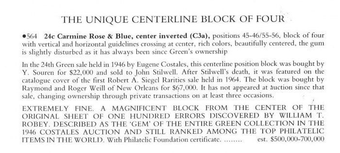 In the 24th Green sale held in 1946 by Eugene Costales, this centerline position block was bought by Y. Souren for $22,000 and sold to John Stilwell. After Stilwell 's death, it was featured on the catalogue cover of the first Robert A. Siegel Rarities sale held in 1964. The block was bought by Raymond and Roger Weill of New Orleans for $67,000. It has not appeared at auction since that sale, changing ownership through private transactions on at least three occasions.
