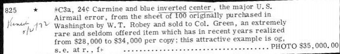 #C3a, 24c Carmine and blue inverted center, the major U.S. Airmail error, from the sheet of 100 originally purchased in Washington by W.T. Robey and sold to Col. Green, an extremely rare and seldom offered item which has in recent years realized from $28,000 to $34,000 per copy; this attractive example is og, s.e. at r., f+